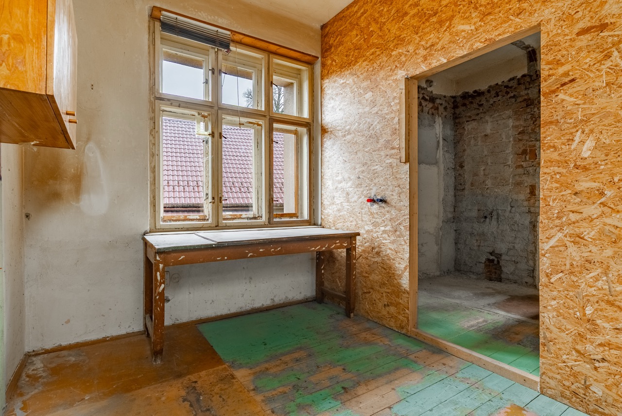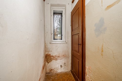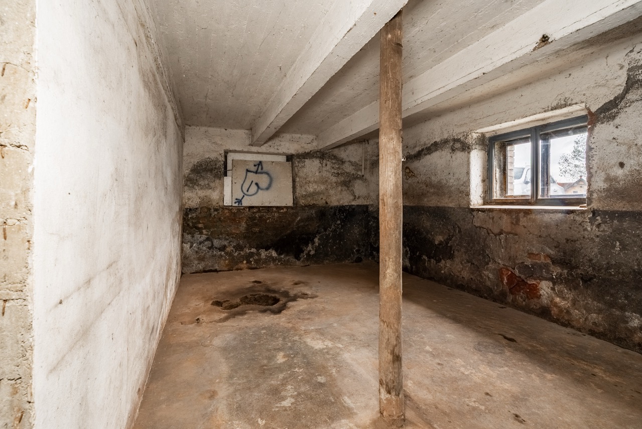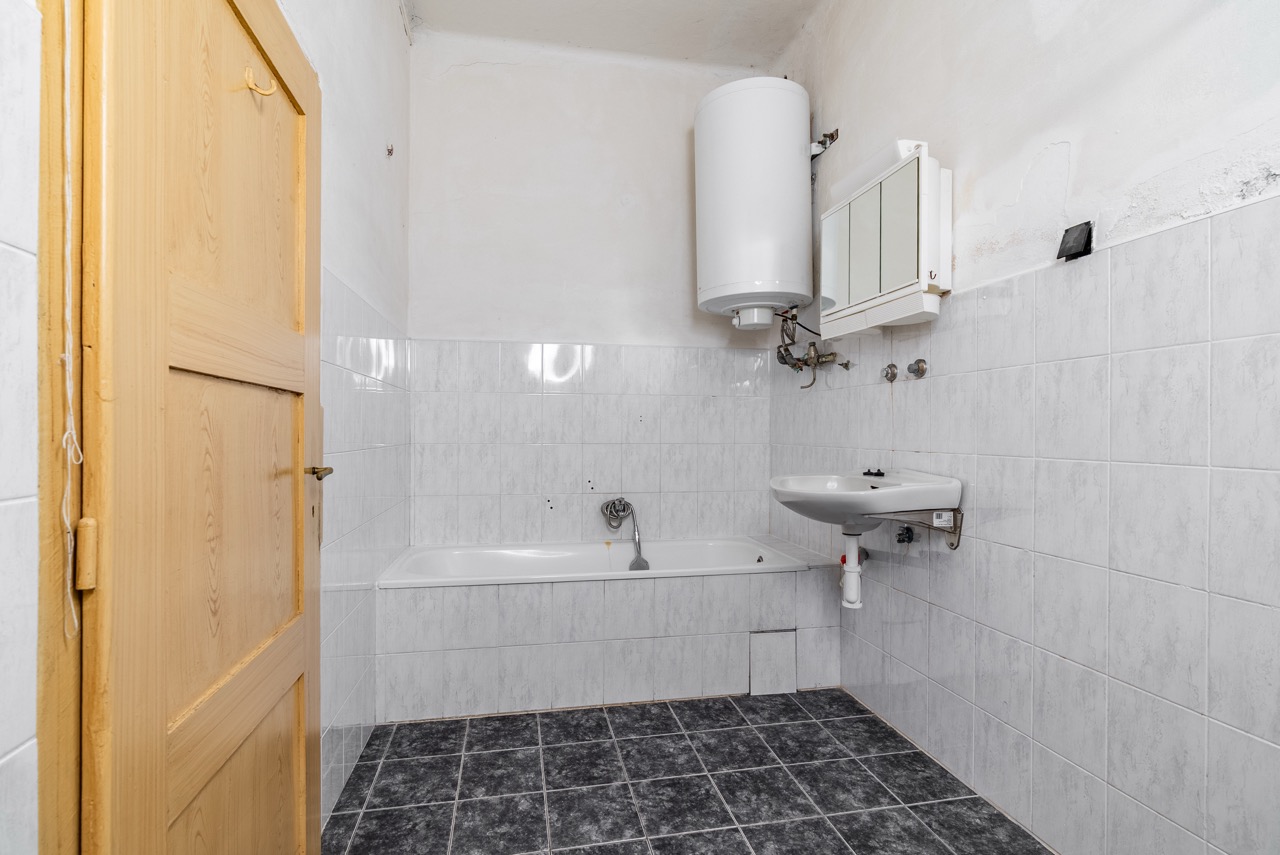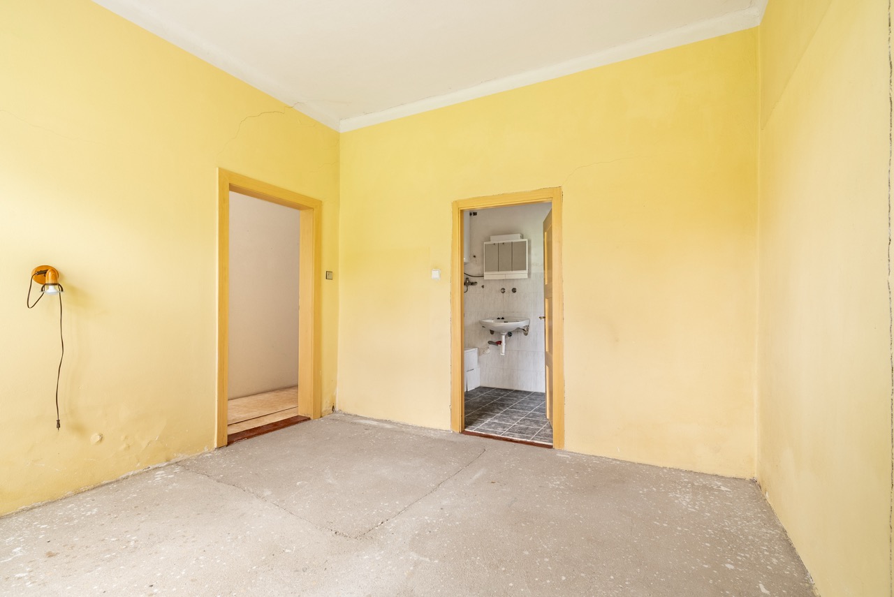Heating is currently provided by electric direct heaters, and domestic hot water is supplied via boilers. The house is connected to the municipal water supply, and sewage is channeled into a septic tank. The municipality plans for the future construction of a public sewage system. Behind the house, there is a smaller garden area suitable for the placement of a pergola. Vehicle parking can be conveniently arranged directly in front of the building. It is essential to note that the property requires a complete refurbishment. This investment will grant you full control over the final execution. The existing roofing material is an asbestos cement covering.