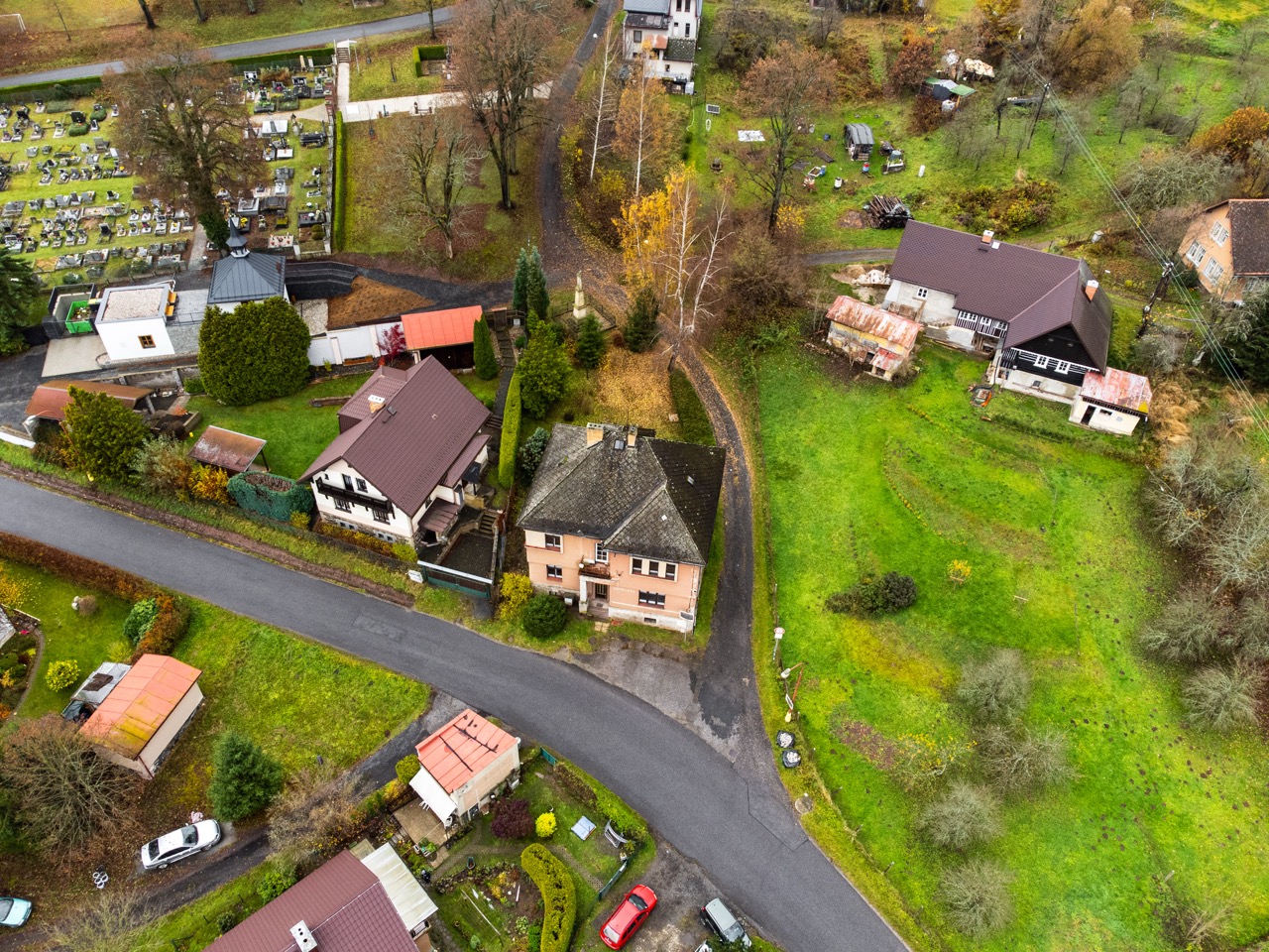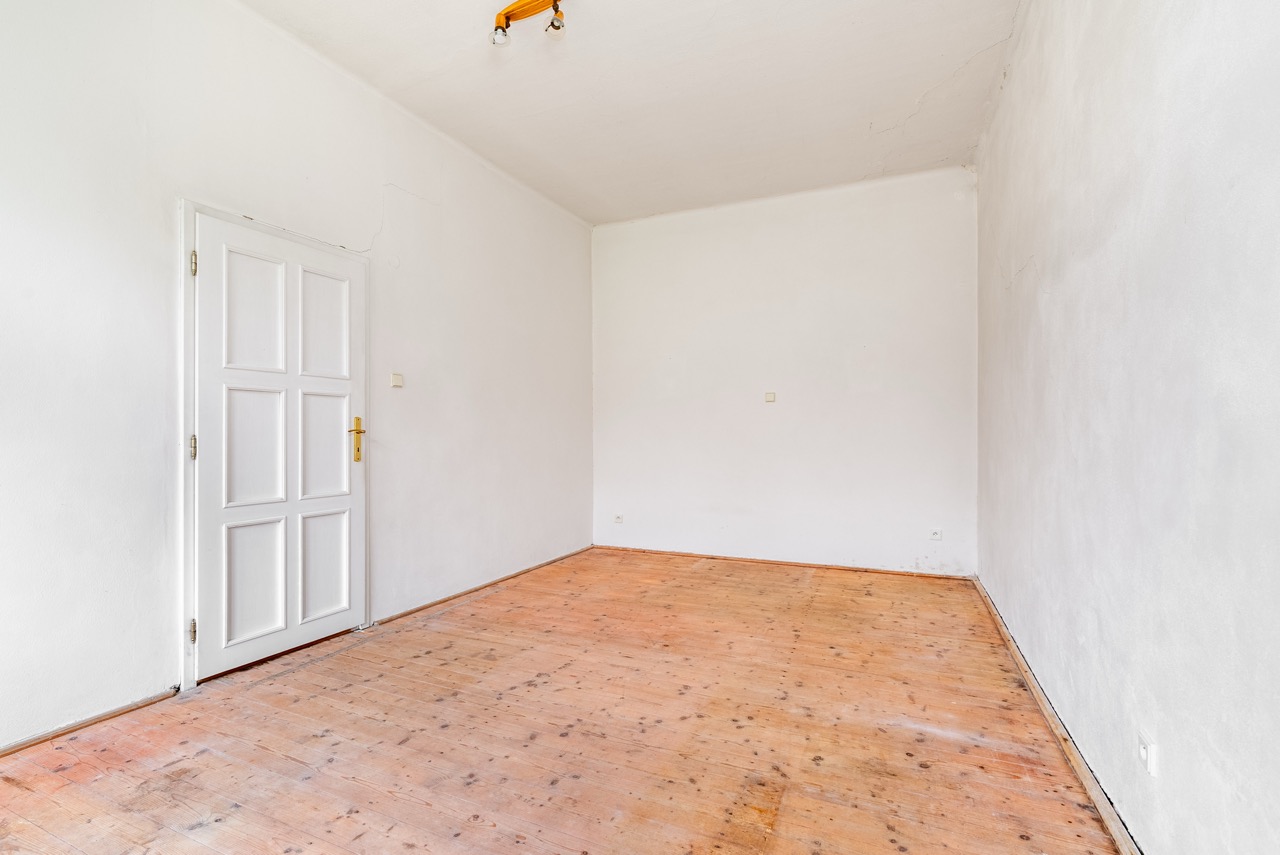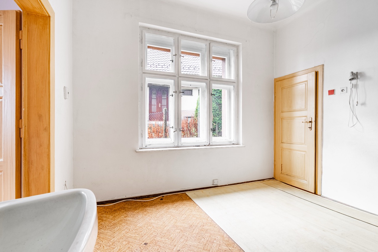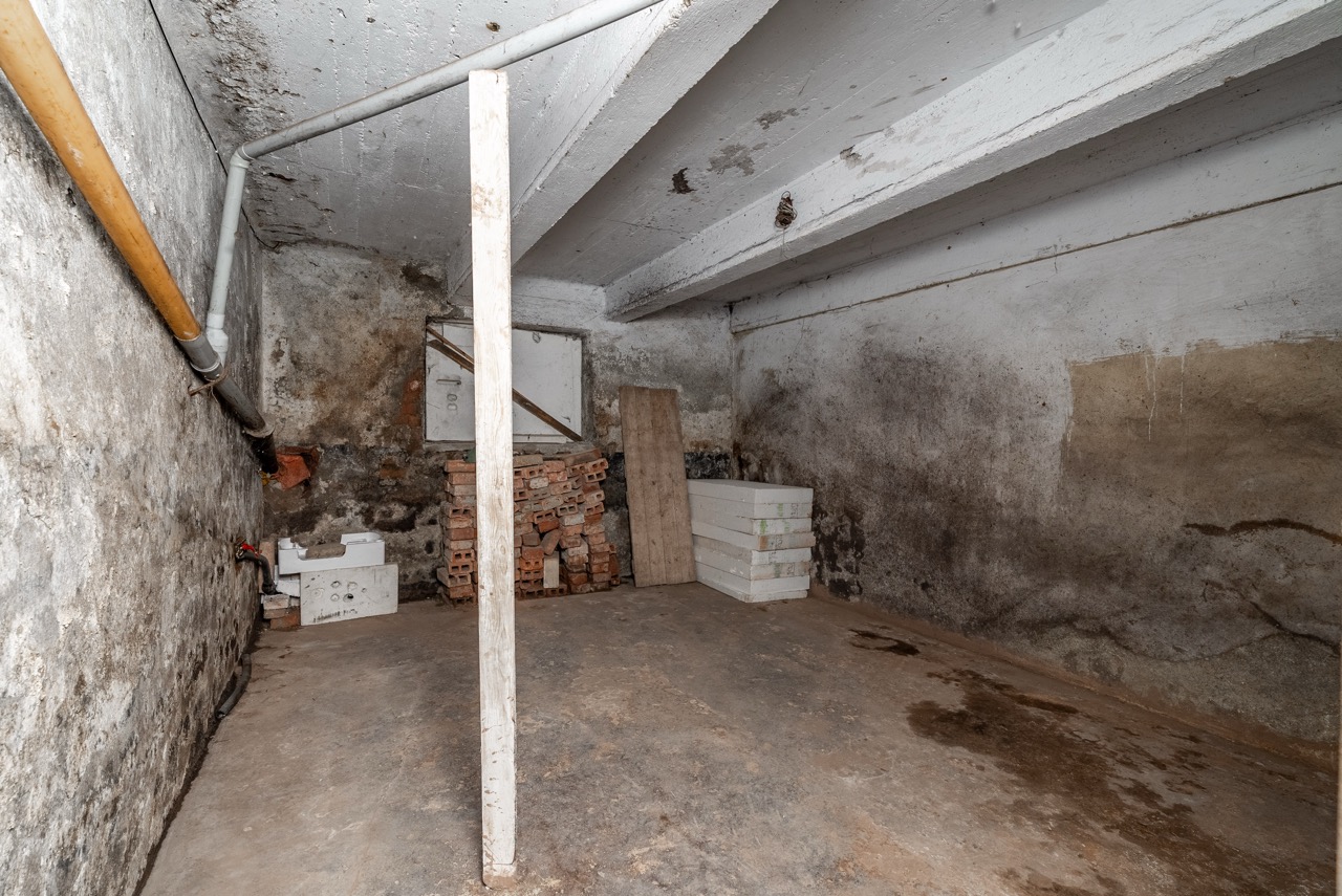 Heating is currently provided by electric direct heaters, and domestic hot water is supplied via boilers. The house is connected to the municipal water supply, and sewage is channeled into a septic tank. The municipality plans for the future construction of a public sewage system. Behind the house, there is a smaller garden area suitable for the placement of a pergola. Vehicle parking can be conveniently arranged directly in front of the building. It is essential to note that the property requires a complete refurbishment. This investment will grant you full control over the final execution. The existing roofing material is an asbestos cement covering.