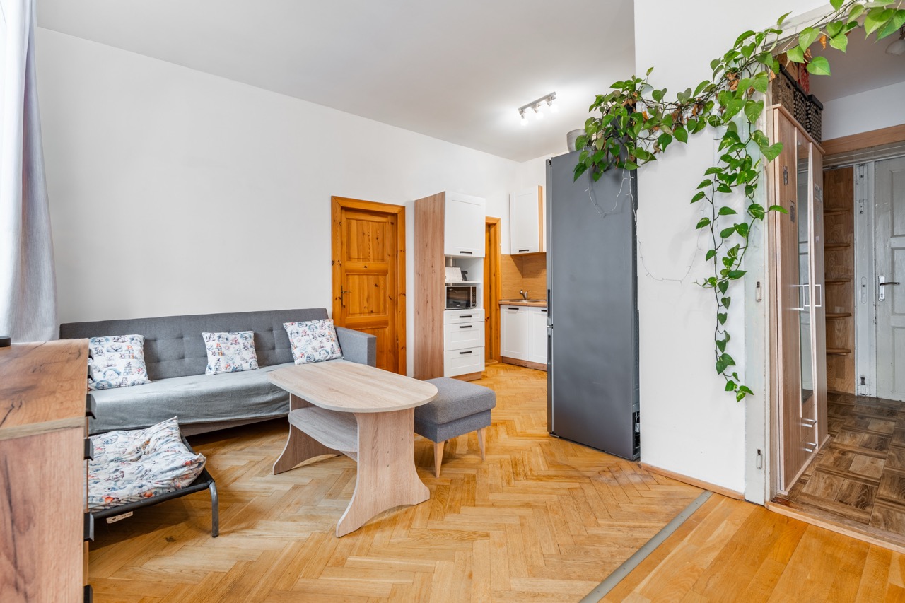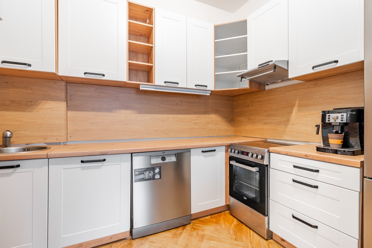 The original wooden windows have been replaced with newer wooden double-glazed windows, fully in accordance with the requirements of the heritage authority. The apartment also features a quiet bedroom and a bathroom equipped with a bathtub. Parquet floors and laminate flooring are laid throughout the apartment.