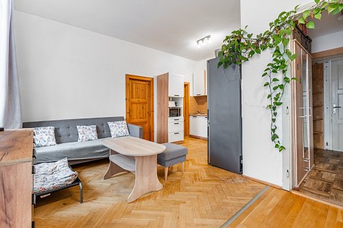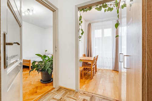 Dispozici dále tvoří pokoj s komorou a světlý obývací pokoj s přímým vstupem na balkon. Obývací pokoj je prakticky propojen s kuchyní, kde majitelé bytu nedávno instalovali novou kuchyňskou linku.