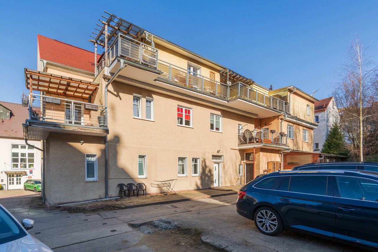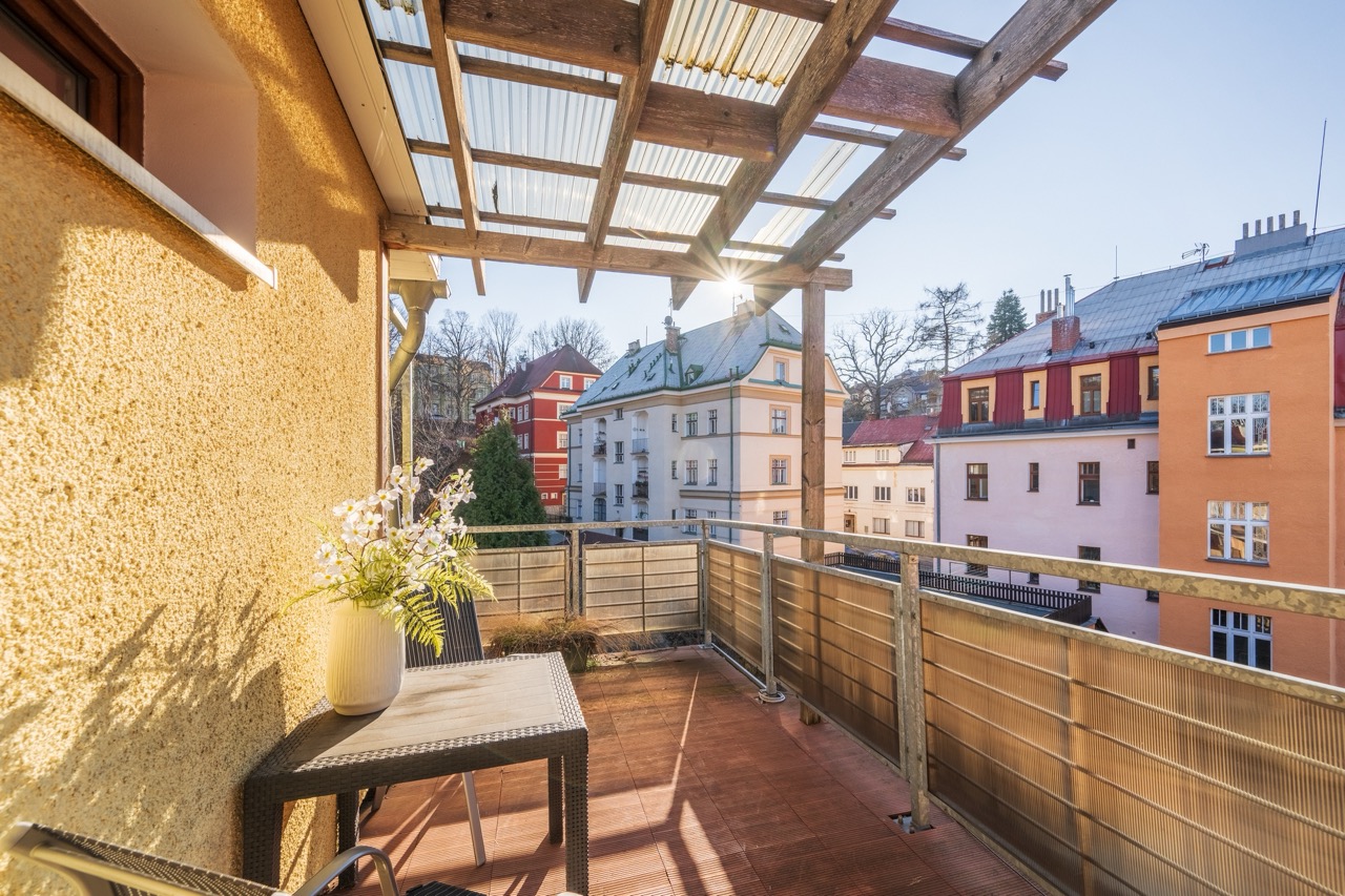 K bytu náleží velkorysá terasa a balkon o celkové ploše přibližně 23 m², které poskytují příjemný venkovní prostor v těsné blízkosti centra města.