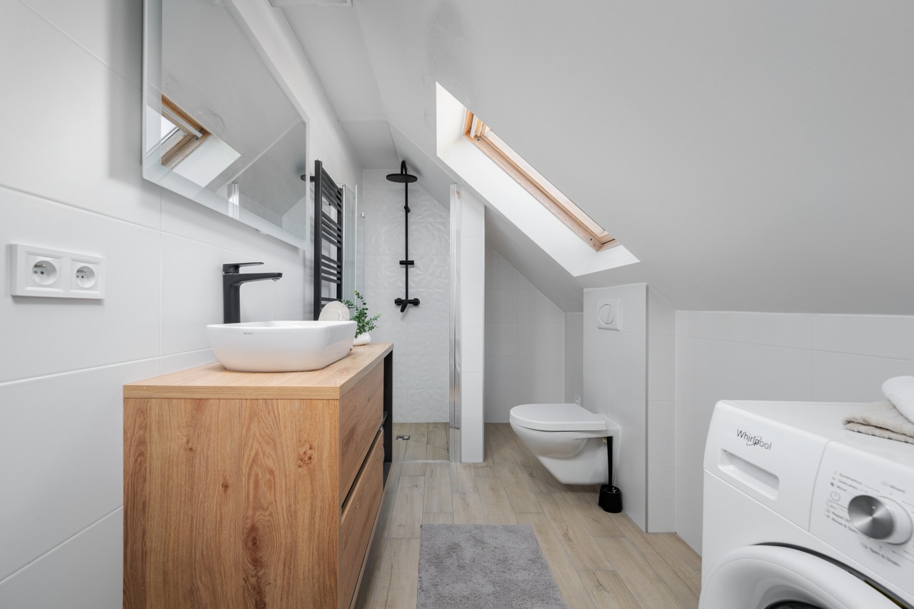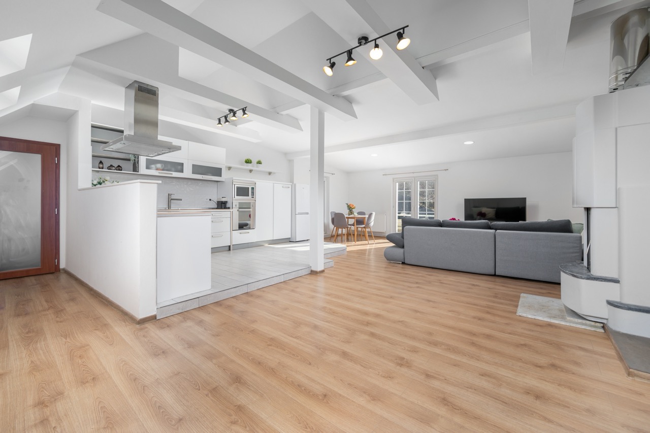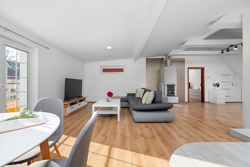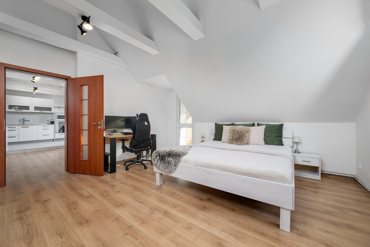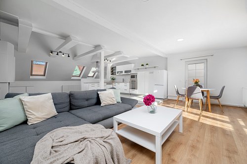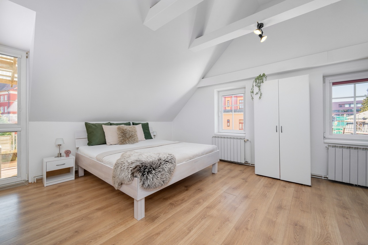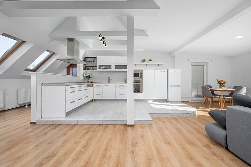 We offer for rent a very spacious and airy 1-bedroom attic apartment (2+KK) with a floor area of 89.17 m², located on the 3rd floor of a building in Chrastavská Street, Liberec.